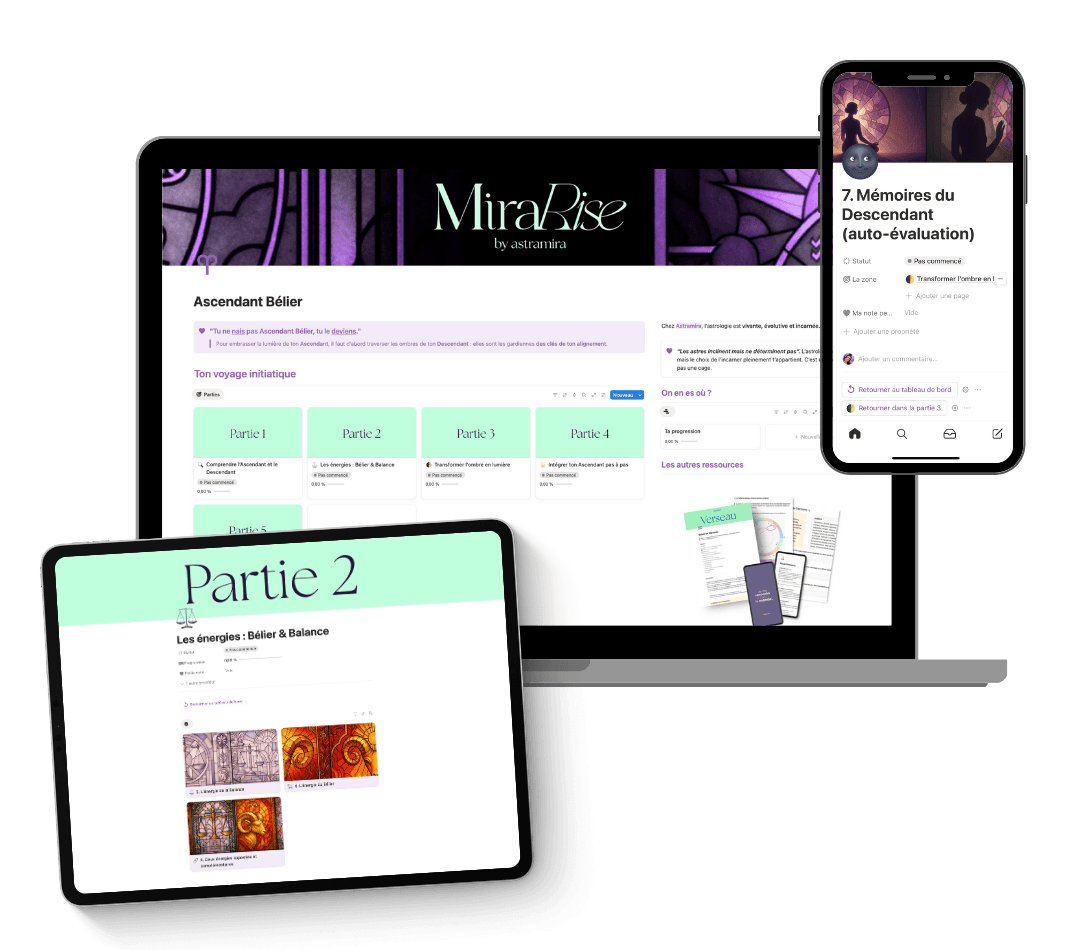 MiraRise est un espace introspectif pour incarner l’énergie de ton Ascendant et apprendre à transmuter les parts d’ombre de ton Descendant.